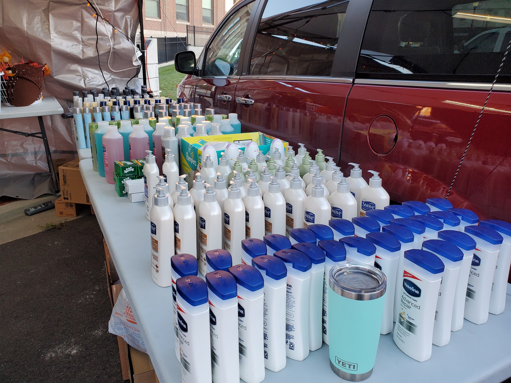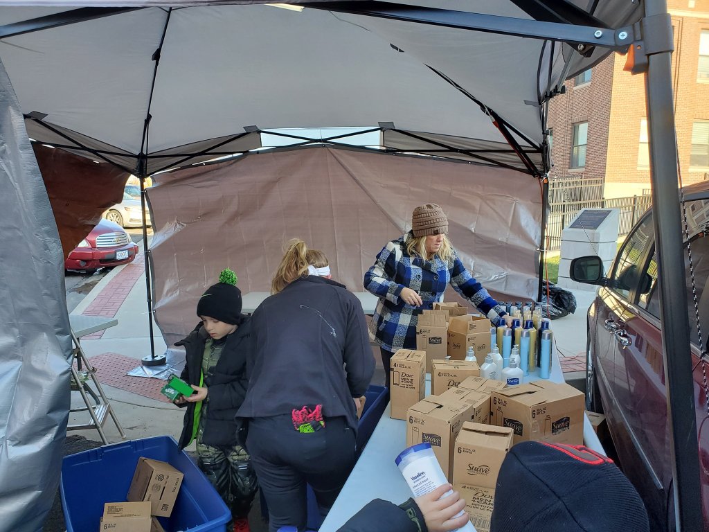In the blessing tent, we offered Hygiene products including lotions, soaps, shampoo, conditioner, and dental care items that were donated by Unilever in Jefferson City and several local dental offices. We had over 110 families come through our tent in two hours. We went through so many cases of product that we had to leave 30 minutes in to the event and go get more. We had winter hats, scarves and gloves for both children and adults, which went very quickly given the brisk fall weather we experienced. It was especially appreciated that some of these hats and scarves were hand made by the “Knit Witts” knitting club from First Presbyterian Church, which added an extra special touch. Every time we would see a child walk in the tent, Uplift volunteers would make sure to put a hat on their head if they needed one. Each family could take a total of five items of their choice from our tent, and were offered prayer as they exited. If they wanted prayer, we stopped what we were doing and prayed with them there on the spot. We had printed materials from Genesis Church and Centennial Baptist Church, which we distributed to those interested in finding a church home.